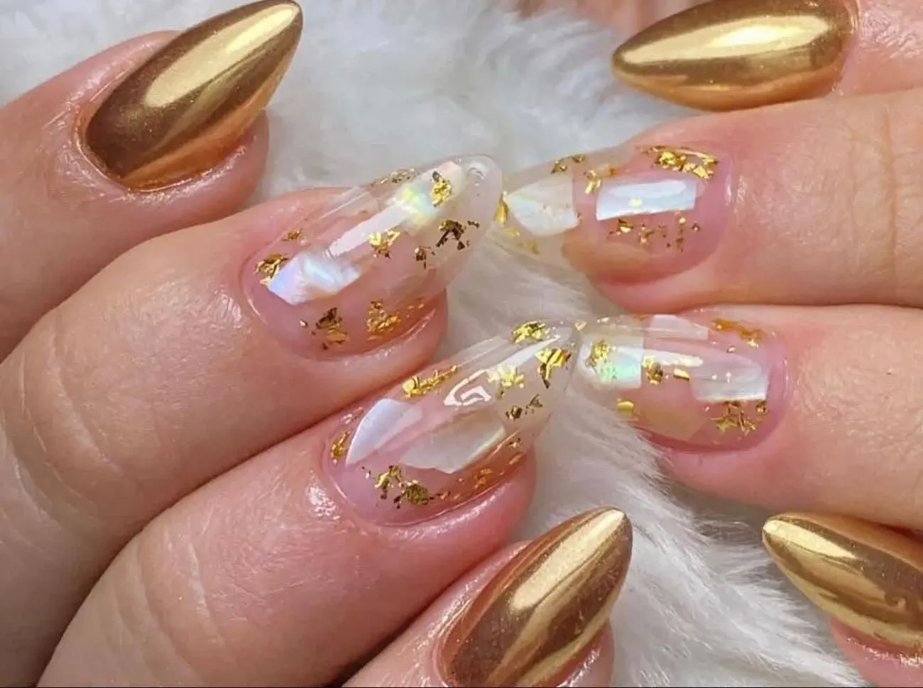 A aplicação de folha de ouro é uma das tendências mais luxuosas para as unhas. Pequenos flocos de folha de ouro são aplicados sobre uma base de esmalte, que pode ser de qualquer cor, e selados com um finalizador de alto brilho (top coat). A aplicação pode ser concentrada em uma área específica da unha ou distribuída de forma aleatória para um visual mais abstrato e moderno. É uma escolha certa para a virada do ano.