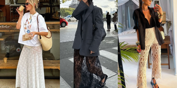 - Vestido de renda sobre calça: Misture a leveza da renda à estrutura das calças — jeans, alfaiataria ou até esportivas. Assim, o visual fica fashionista e moderno.